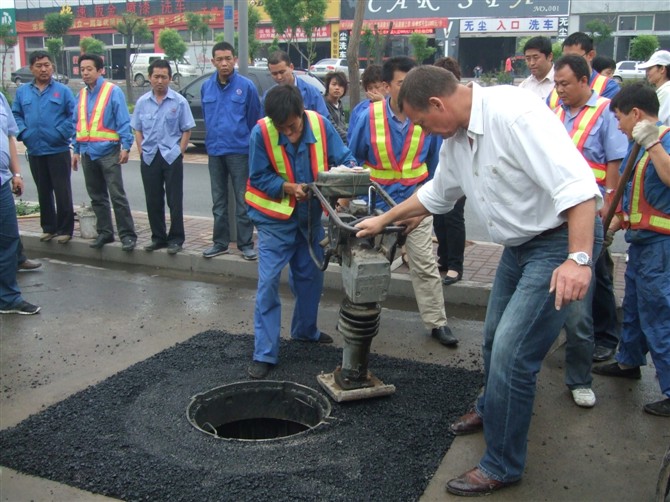 記者在現場看到,施工人員在井蓋周圍挖出一個深約十幾公分,邊長各約一米的六邊形施工面,緊挨井蓋放置一個約有十幾公分高的圓形模具,將其周圍清理干凈后,涂上一層結合油,鋪上一層約10公分厚的瀝青夯實,然后再鋪上一層瀝青,瀝青要高出路面一些,用壓道機碾壓,取出模具后,將防沉降井蓋放入。在整個施工過程中,德國專家一邊指導一邊親自操作。施工完畢后,井蓋框和路面成為一個整體。